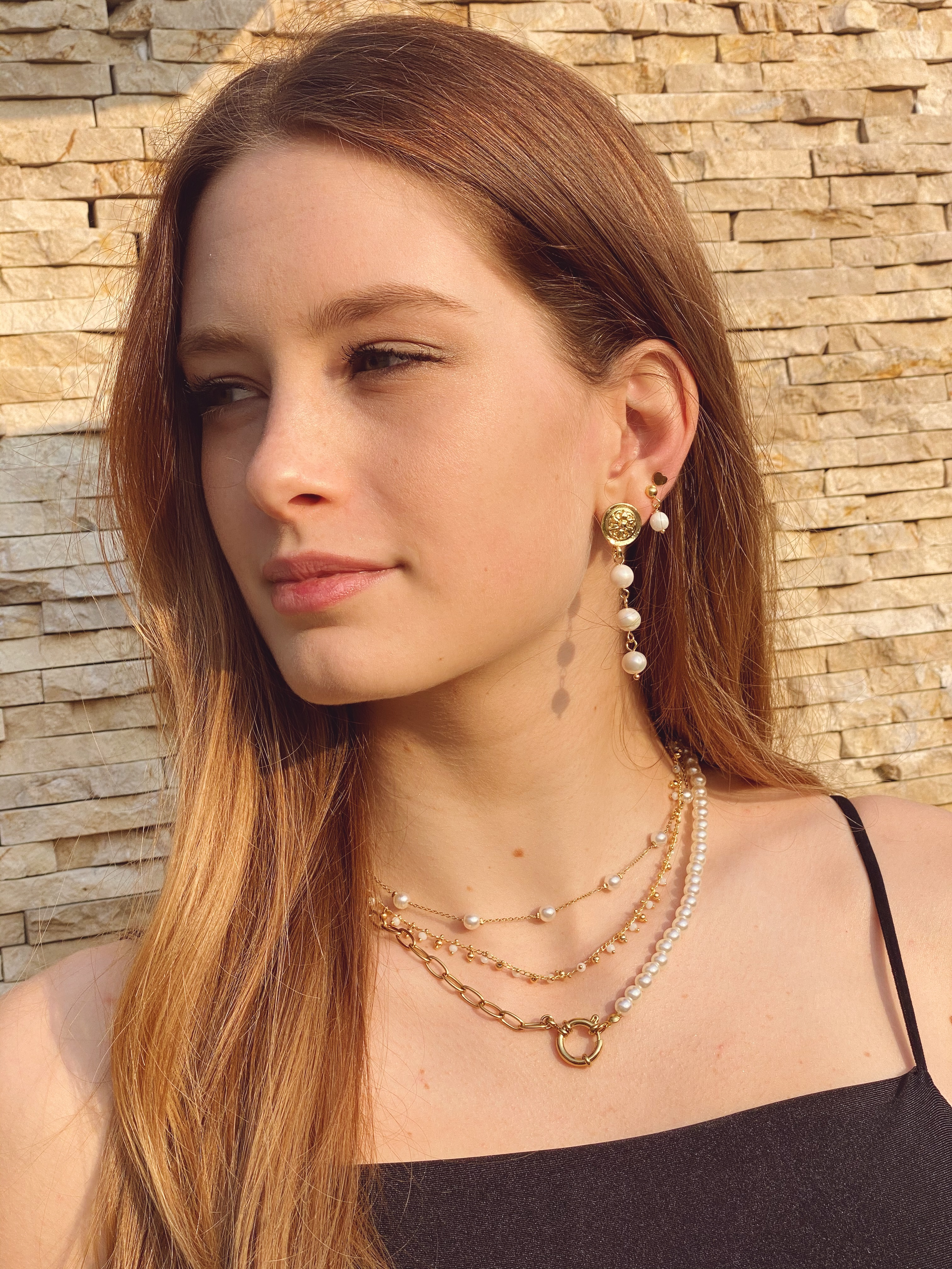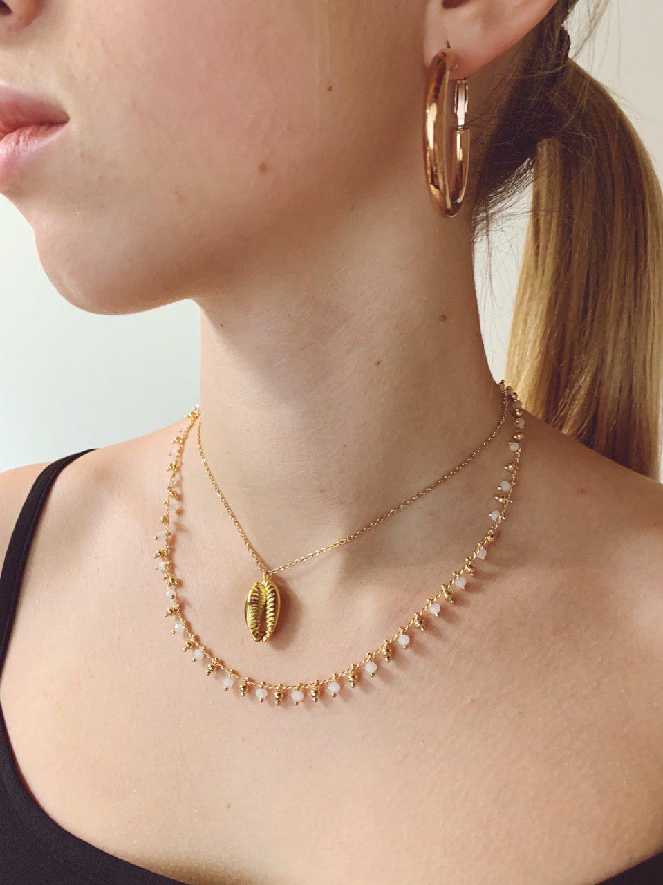 collana in acciaio e perline bianche e oro