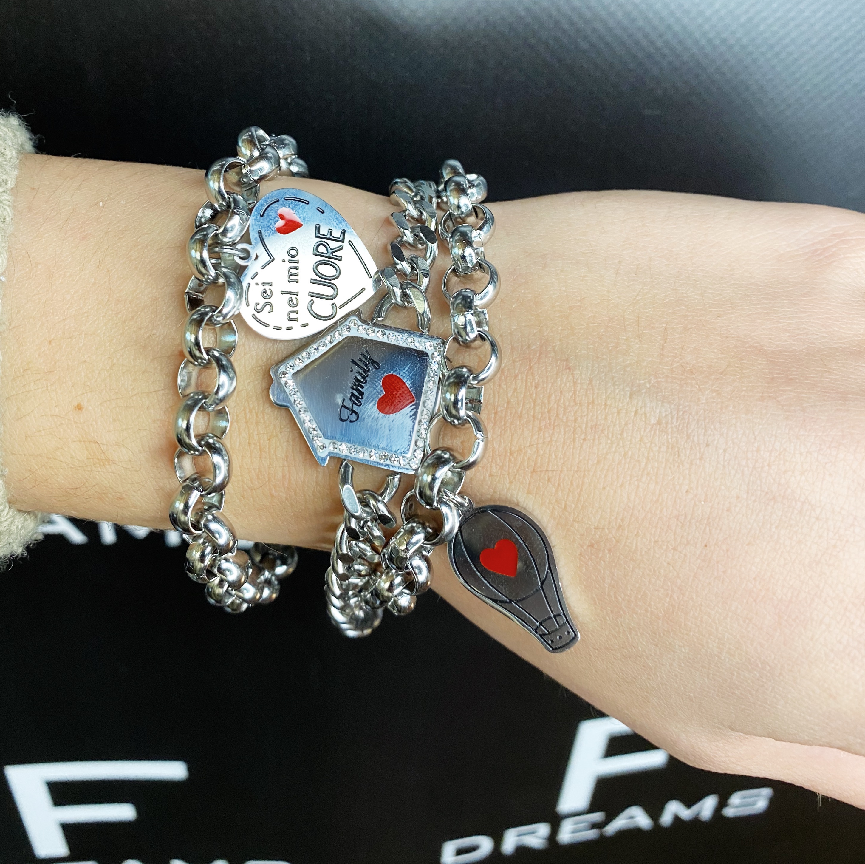 Nuovo bracciale con catena e un dolcissimo charms a cuore! Descrizione prodotto: Bracciale in acciaio, resta bello nel tempo Lunghezza 20 cm, con possibilità di regolare il moschettone nella maglia rendendolo più corto Per ulteriori info e personalizzazioni servizio Whatsapp disponibile: +39 373 7252294 Vuoi regalare questo gioiello FDreams? Seleziona nel carrello "Questo ordine è un regalo?" Lo riceverai nella nostra scatolina con fiocco e bigliettino d'auguri in cui potrai scrivere la tua dedica.